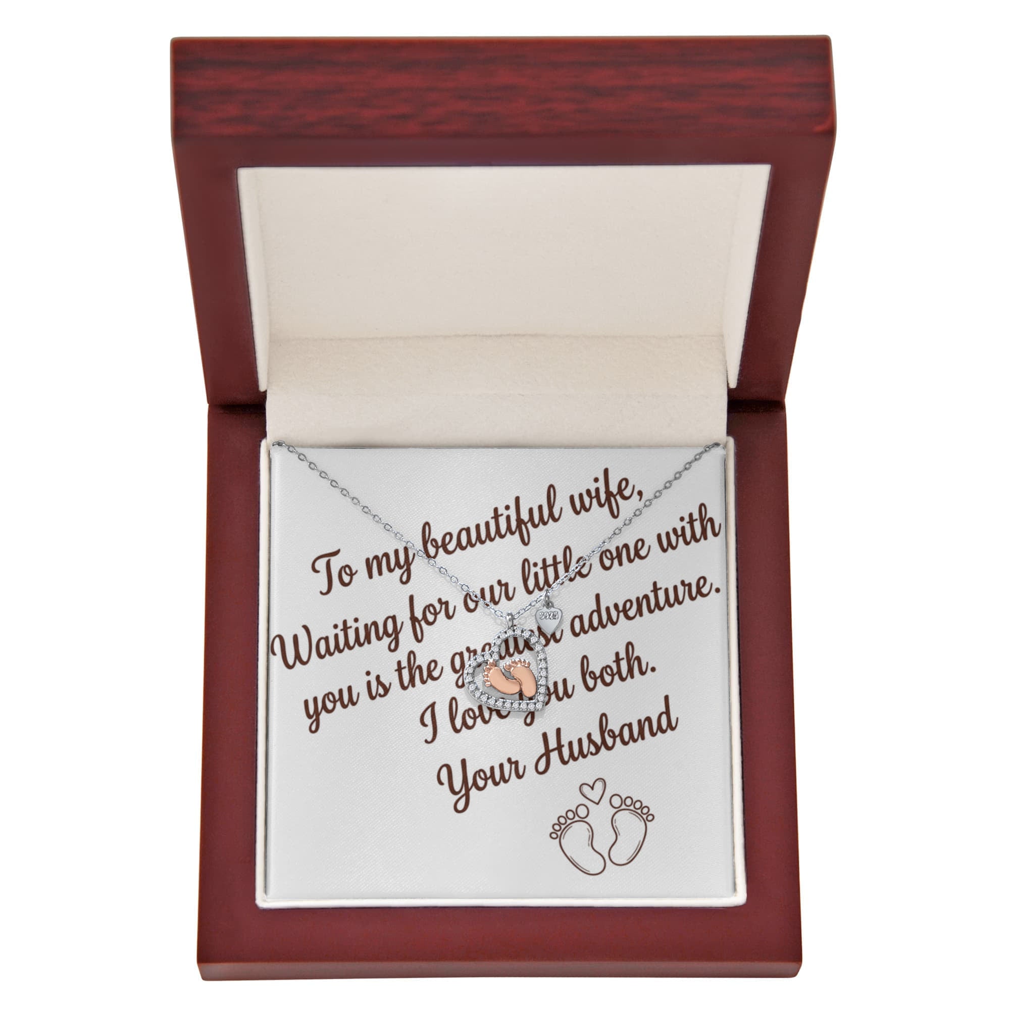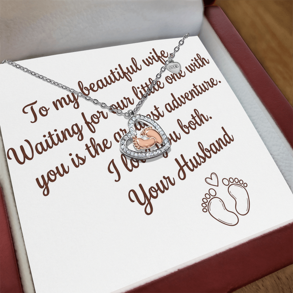 Show your wife exactly how much she and your growing family mean to you. The Baby Feet Heart Necklace is a breathtaking symbol of love, family, and the precious new beginnings you’ve shared together. This isn't just jewelry; it’s a heartfelt tribute to her journey through motherhood and the unbreakable bond you share as a couple.